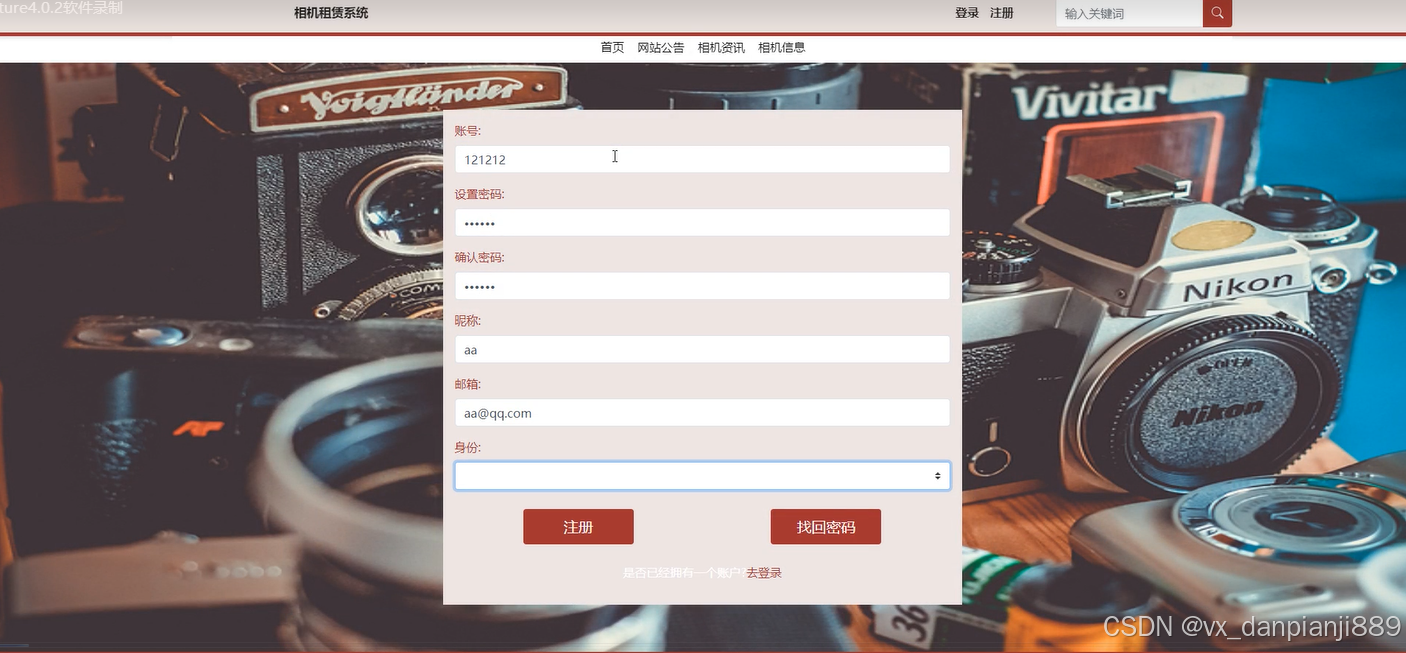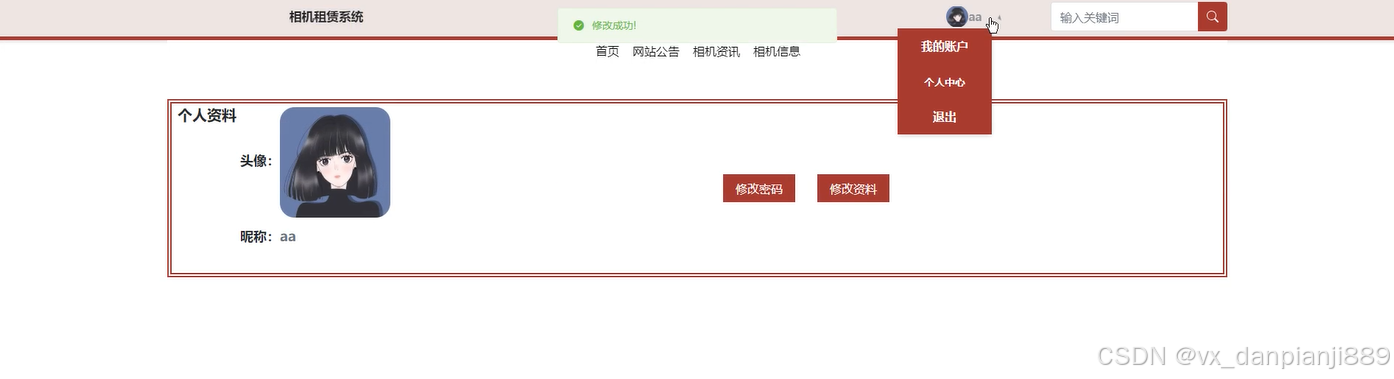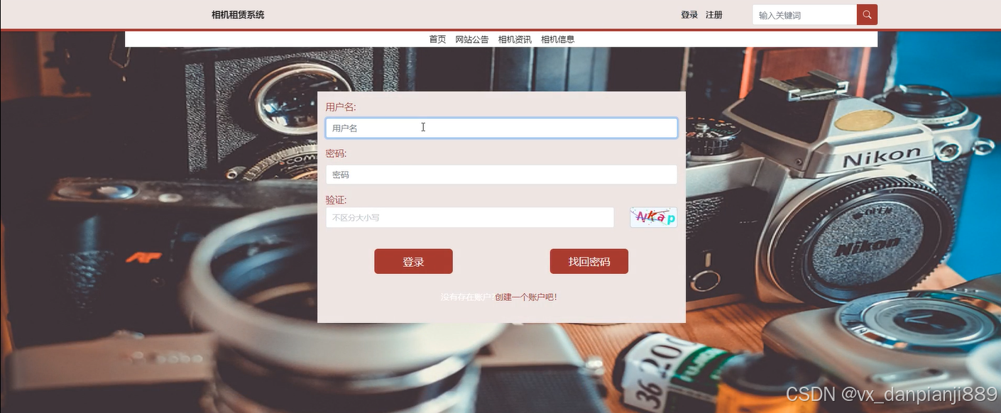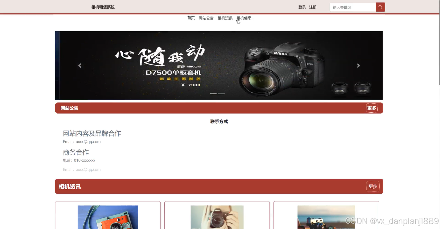 (2)查看相机租赁系统的首页信息:相机租赁系统的首页信息包含了首页、相机资讯、网站公告、相机信息。