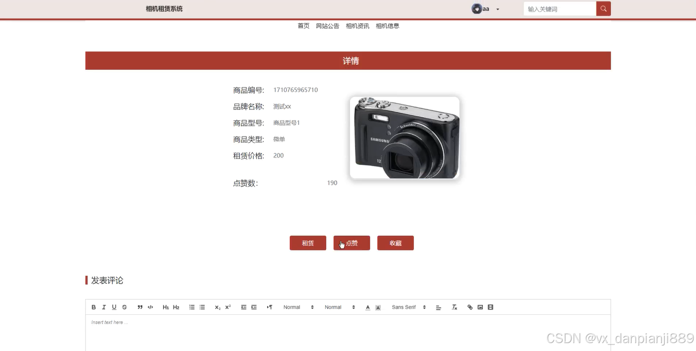 当用户点击“相机信息”这一菜单按钮,会显示管理员在后台发布的所有的相机信息,支持通过关键词对相机信息进行搜索,选择需要的相机信息点击可以进入到相机信息详细的介绍界面,在详细界面可以查看到车辆的商品编号、品牌名称、商品型号、商品类型、租赁价格等信息,同时可以进行租赁、点赞、收藏、评论操作,界面如下图5-7所示。