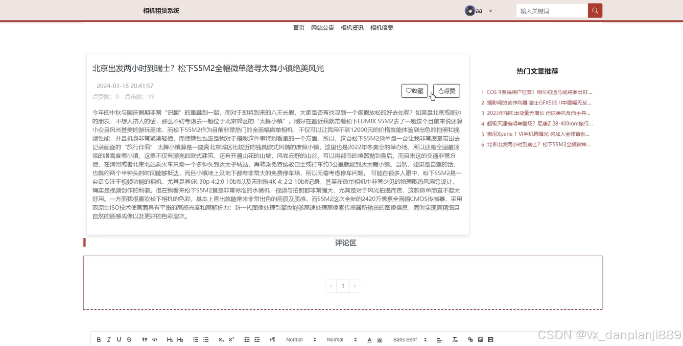 当访客点击相机租赁系统中导航栏上的“相机资讯”后将会进入到该“相机资讯”列表的界面,然后选择想要看的相机资讯信息,点击进入到详细界面,在详细界面可以收藏+赞+评论等操作,相机资讯详情展示页面如图5-6所示。
