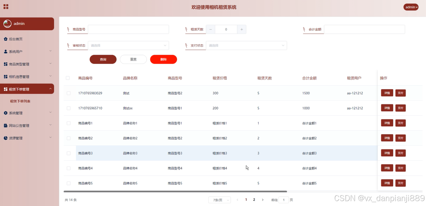 管理员点击“租赁下单”会显示出所有的租赁下单信息,支持输入商品型号或者租赁天数对租赁下单信息进行查询,同时可以选择某一条租赁下单信息,点击“删除”进行删除,也可以点击后面的“支付”按钮对租赁下单的支付信息进行设置。界面如下图5-12所示。