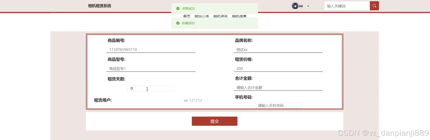 当用户在相机信息详情界面想要进行租赁,点击下方的“租赁”按钮,就会跳转到租赁信息填写界面,根据界面提示输入租赁信息,点击“提交”按钮,租赁就完成了。界面如下图5-8所示。