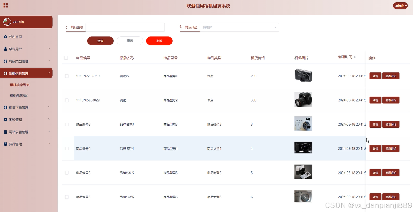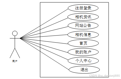 The core functions of the system include system users, product types, camera information, rental ordering, website announcements, etc. User management is responsible for user registration, login, information management, and other operations; Camera management includes functions such as camera classification, camera display, camera details, etc; Lease order management allows users to browse cameras, select leases, and confirm orders.