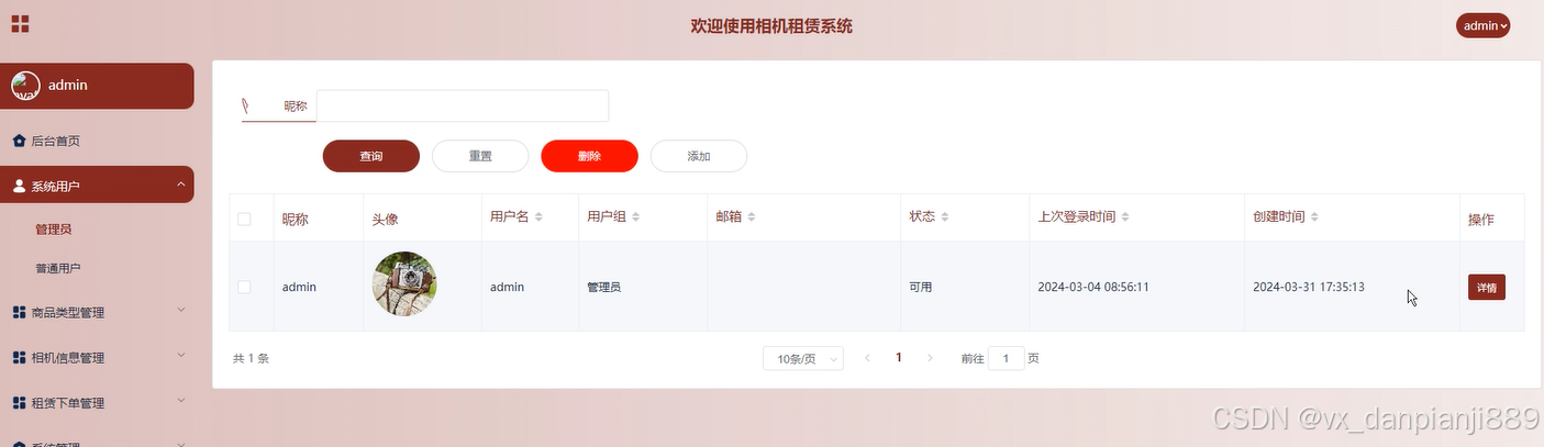 管理员可以对相机租赁系统中所有的用户进行管控,包括了管理员以及普通用户,管理员可以对这两个角色的信息进行增删改查操作。界面如下图5-10所示。
