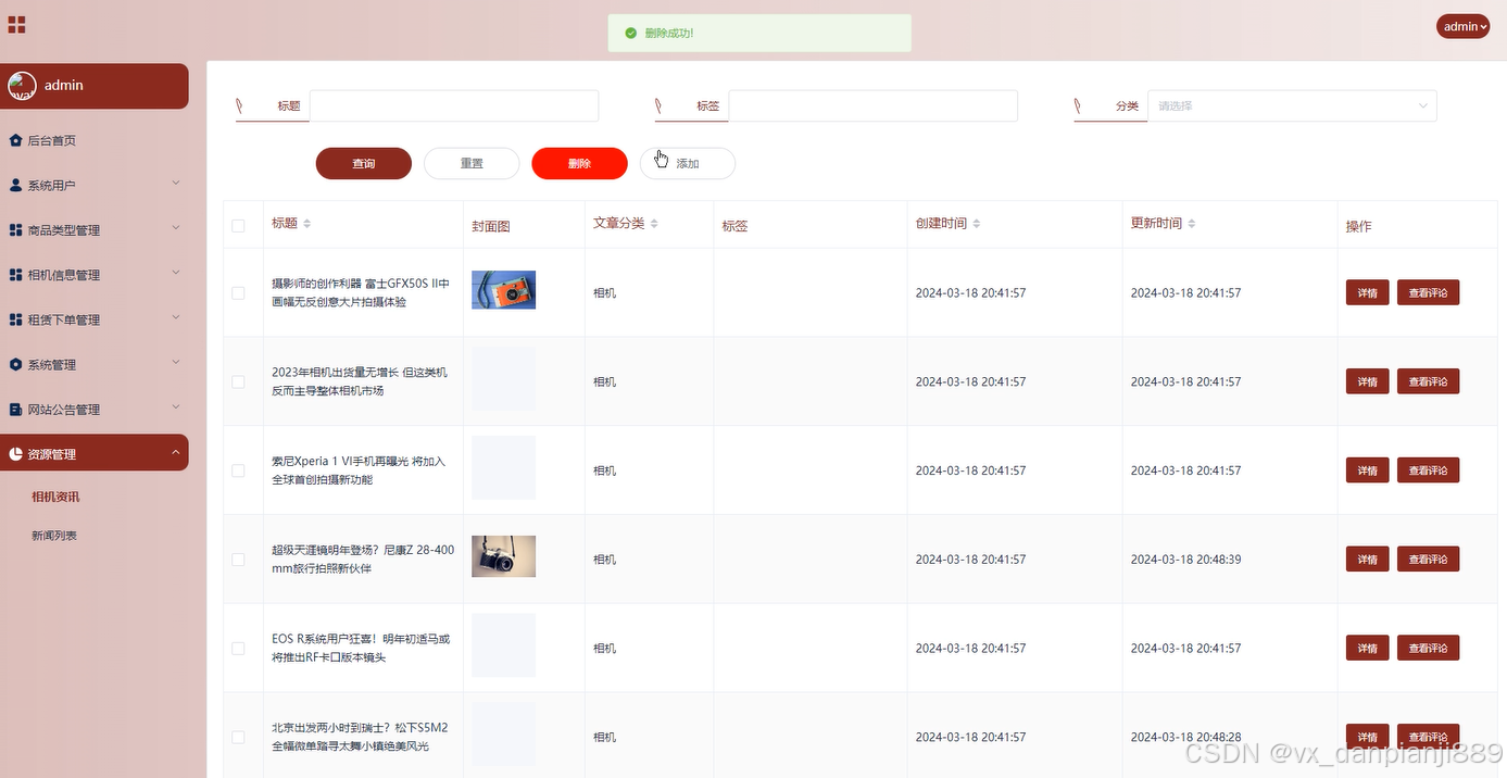 资源管理主要管理员是对相机资讯以及相机资讯所属的分类进行管控,包含了用户对相机资讯提交的评论信息,界面如下图5-13所示。