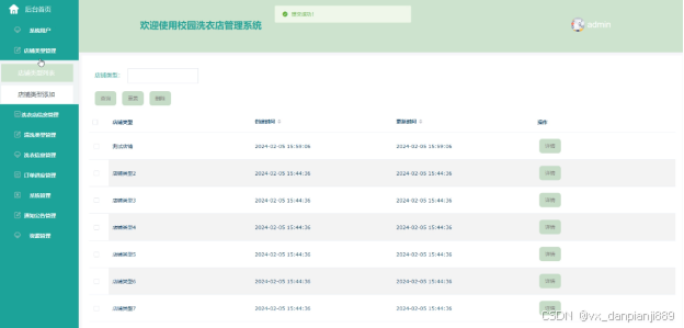 (4)店铺类型管理:管理员点击“店铺类型”系统会把校园洗衣店管理系统当中所有的店铺类型信息都显示出来,管理员可对洗衣店进行添加店铺类型和类型描述管理,并可进行查询、重置或删除等相应操作。