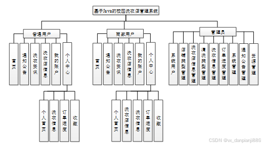 校园洗衣店管理系统我划分为了普通系统用户模块,商家系统用户模块和管理员模块这三大部分。