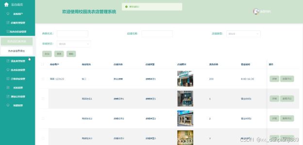 (5)洗衣店信息管理:管理员点击“洗衣店信息管理”会显示出所有的洗衣店信息,支持输入洗衣店名称对洗衣店信息进行查询,如果想要添加新的洗衣店信息,点击“添加”按钮,输入商家用户、商家姓名、店铺 名称、店铺类型、清洗价格、营业时间、店铺简介等信息,点击“提交”按钮就可以添加了,同时可以选择某一条洗衣店,点击“删除”进行删除,也可以对用户提交的洗衣店评论的信息进行管控。
