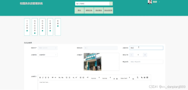 (4)个人中心:商家用户在前台点击“个人中心”可以对个人首页、洗衣店信息、洗衣信息、订单进度和自己收藏的信息进行管理。商家在此模块发布洗衣店信息之后需由管理员审核通过后才会展示在前台。