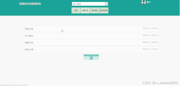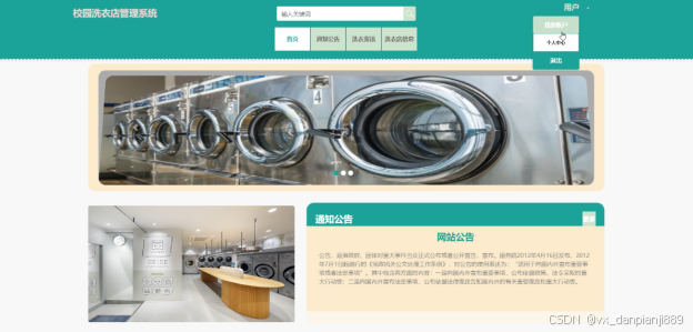 (2)查看校园洗衣店管理系统的首页信息:校园洗衣店管理系统的首页信息包含了首页、通知公告、洗衣资讯、洗衣店信息等。