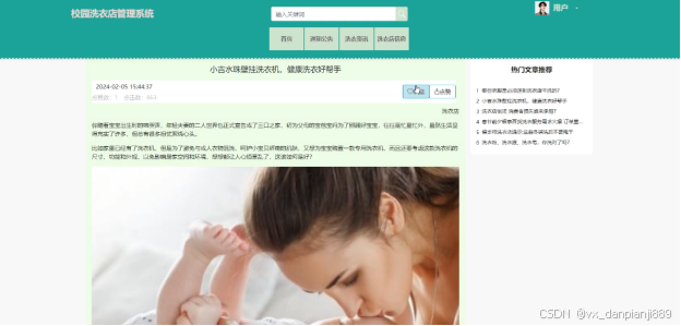 (4)洗衣资讯:当用户点击“洗衣资讯”这一菜单按钮,会显示管理员在后台发布的所有的洗衣资讯,可以查看详情,进行收藏、点赞、评论等;
