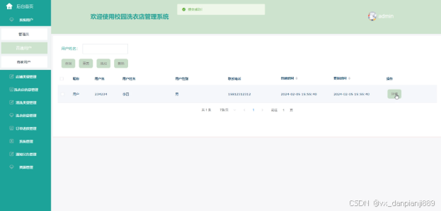 (2)系统用户:管理员可以对校园洗衣店管理系统中的管理员,商家用户、以及前台注册的普通用户进行增删改查。