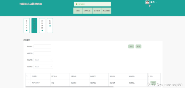 (7)个人中心:普通用户在前台点击“个人中心”可以对个人首页、洗衣信息、订单进度和自己收藏的信息进行管理。