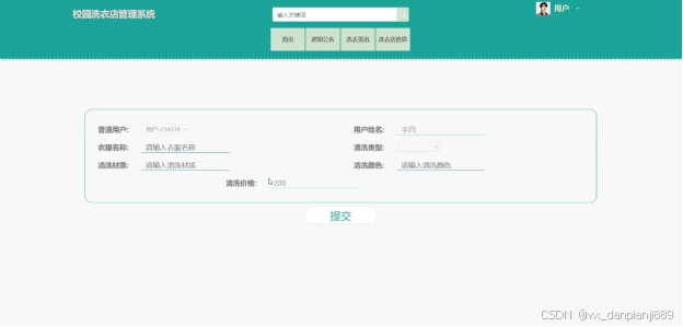 当用户在洗衣店信息详情界面想要进行下单清洗,点击下方的“下单清洗”按钮,就会跳转到下单清洗填写界面,根据界面提示输入下单清洗信息,点击“提交”按钮,洗衣信息就生成了。下单清洗填写界面如下图4-7所示。