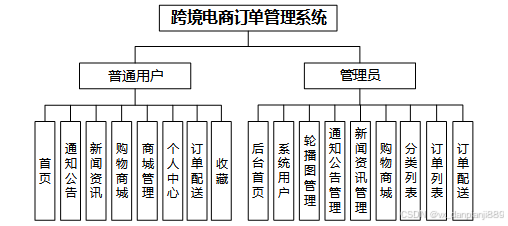 系功能模块分成了管理员及用户两个模块,每个模块登录进去对应相应的功能,具体的功能模块图如图3.1所示。