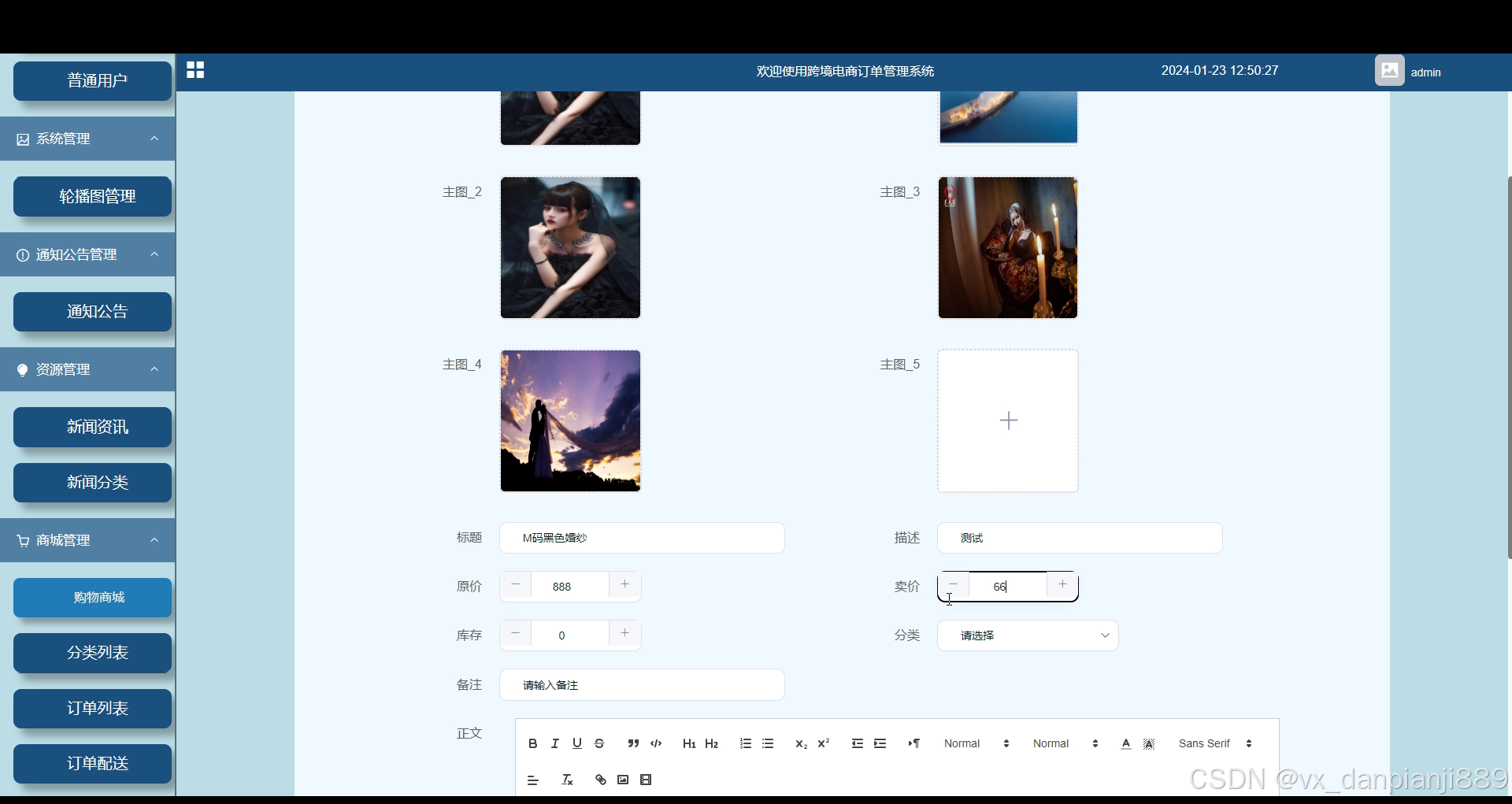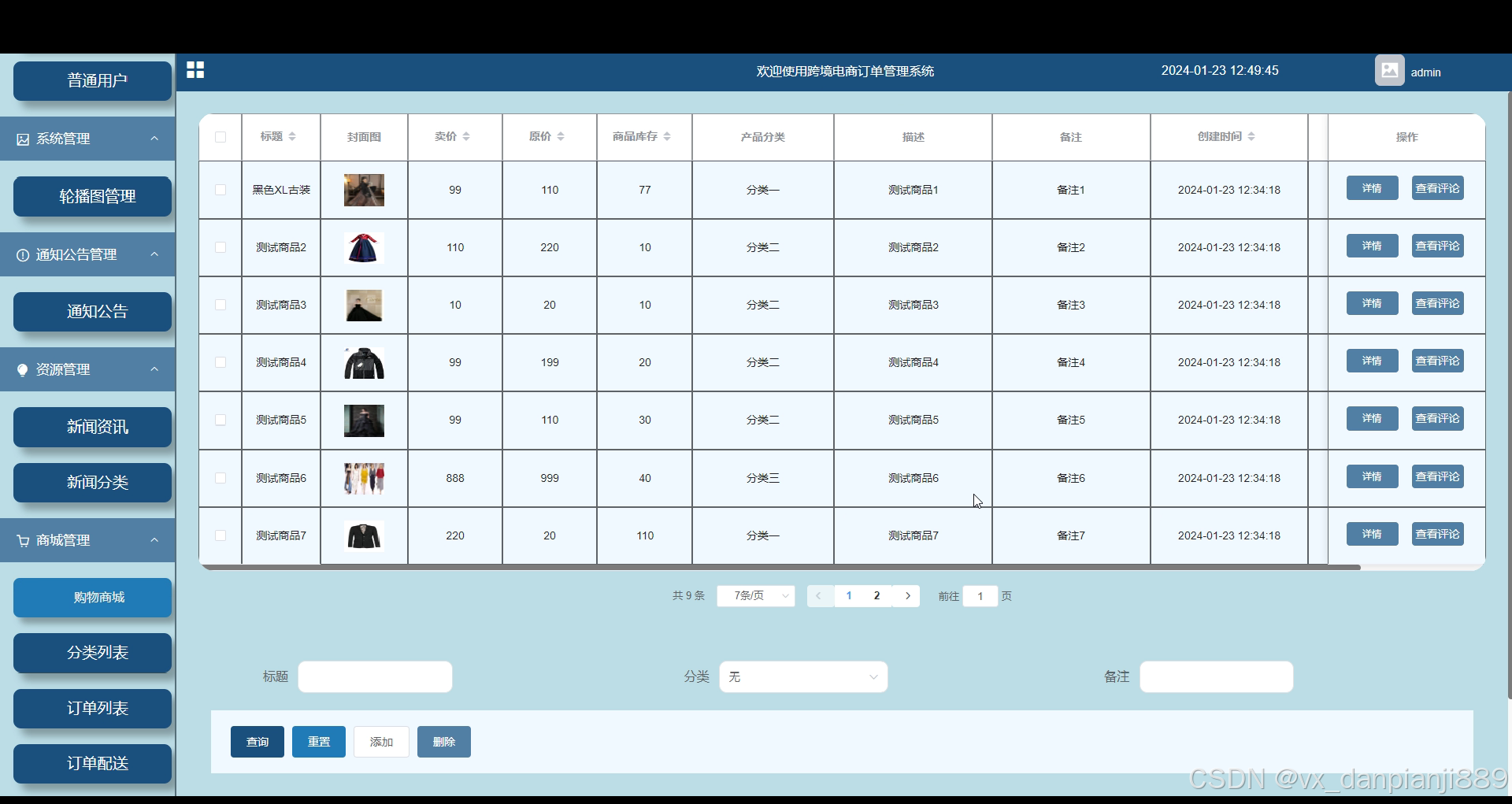购物商城管理:管理商品的信息,包括标题、图片、描述、价格、库存、分类等。管理员可以添加、编辑、删除商品。界面如下图所示。