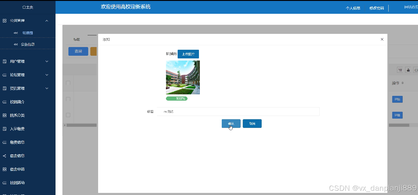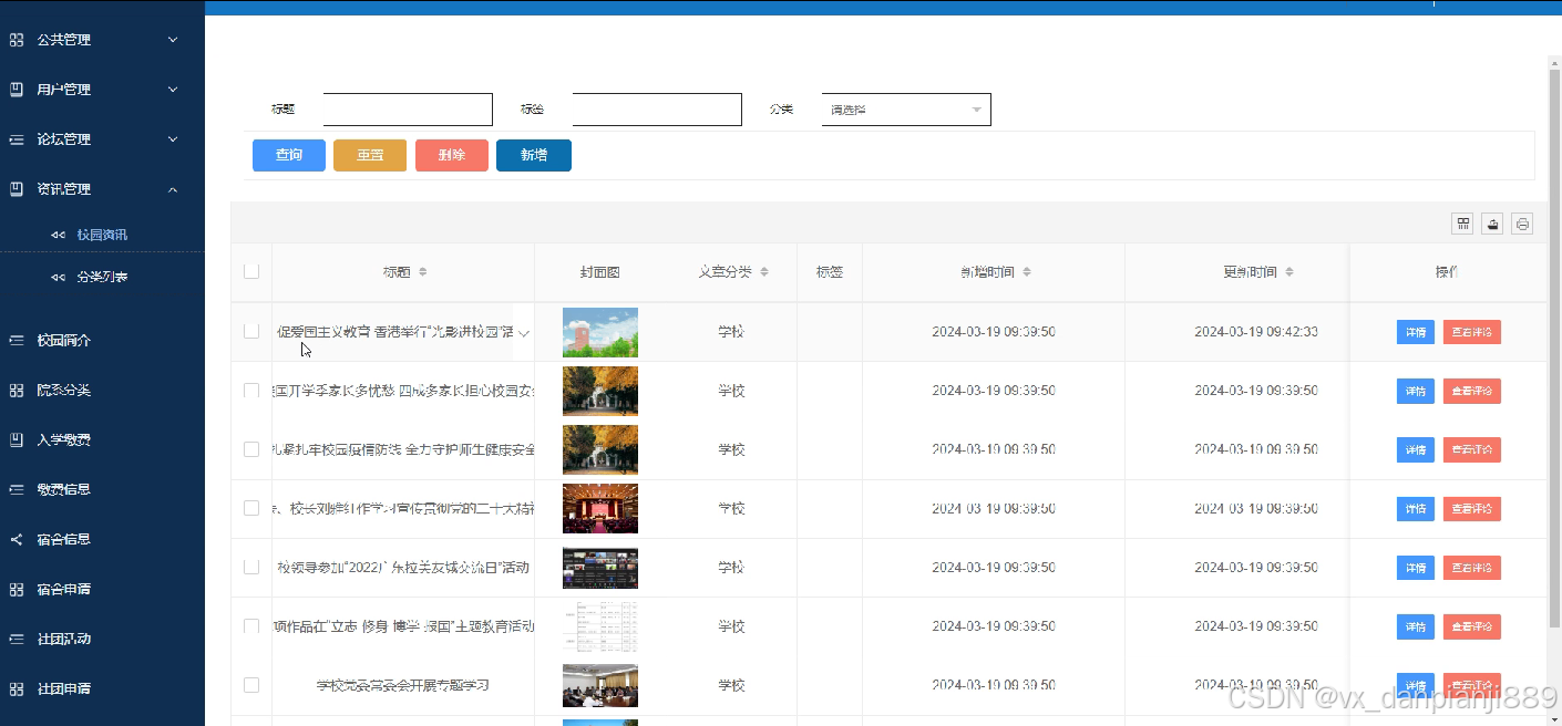 资讯管理:管理校园资讯资源,包括添加、编辑和删除学校相关新闻、活动等信息。界面如下图所示。