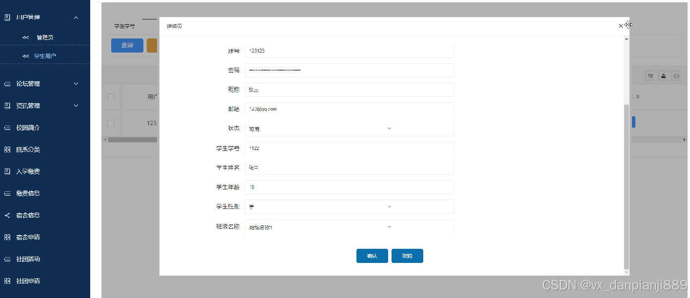 - 系统用户管理:管理不同角色的系统用户,包括校管理员以及前台注册的学生用户。