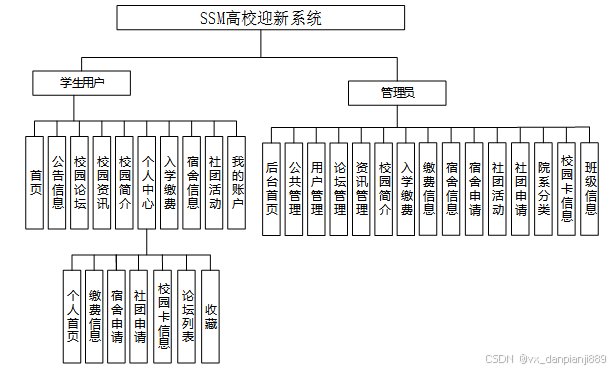 通过高校迎新系统实现以下功能:用户首页、公告信息、校园资讯、校园简介、宿舍信息、入学缴费、社团活动、我的账户、个人中心等功能模块,分别服务于不同用户角色。系统允许新生通过个人中心进行宿舍选择、在线缴费、扫码报到等操作,并提供收藏功能方便记录感兴趣的内容。管理员则可以使用后台管理界面进行系统用户管理、论坛管理、资讯管理、宿舍信息、宿舍申请、入学缴费、缴费信息、社团活动、社团申请、校园卡信息、班级信息管理等操作。具体功能分析如下: