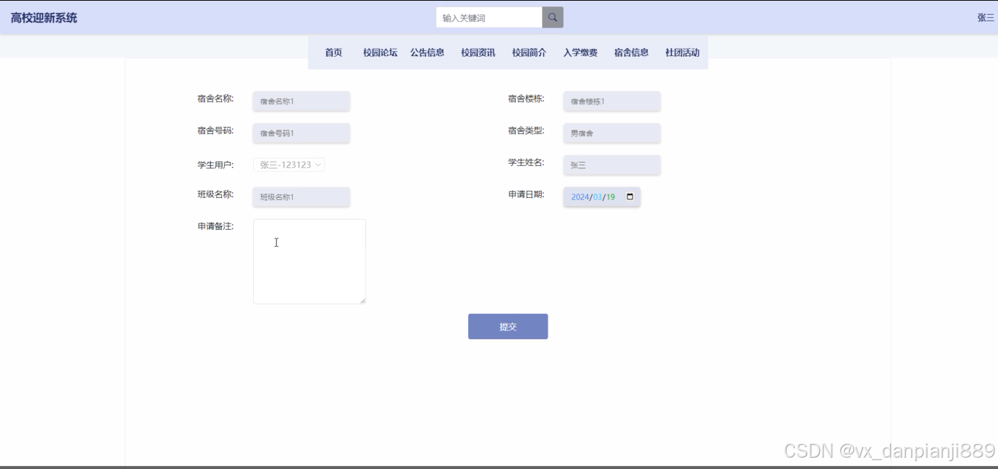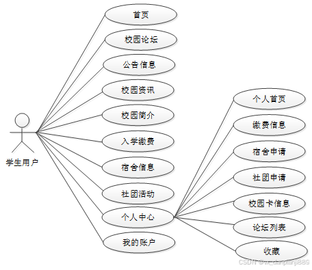 - 个人中心:学生用户在个人中心可对缴费信息、宿舍申请、社团申请、校园卡信息、论坛列表和个人收藏信息进行管理。