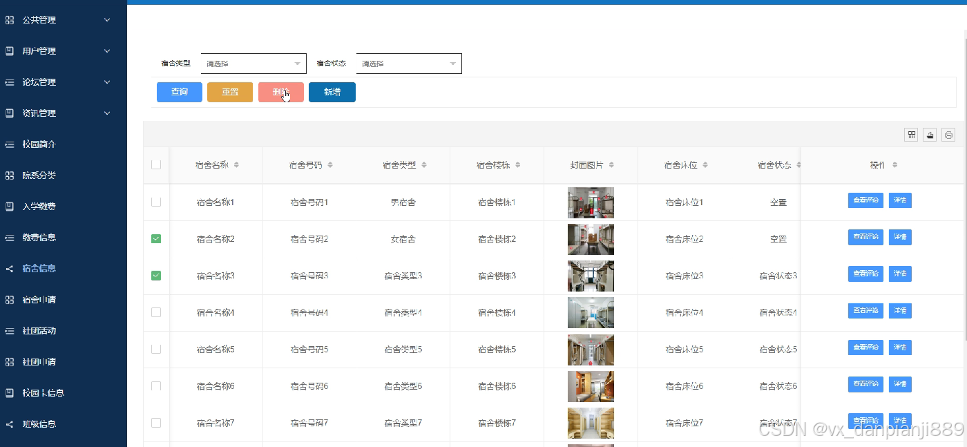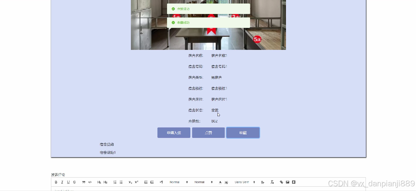 - 宿舍信息:学生用户可以查看宿舍相关信息,包括宿舍楼栋、宿舍床位、宿舍设施等,方便了解宿舍管理并可申请入住,
