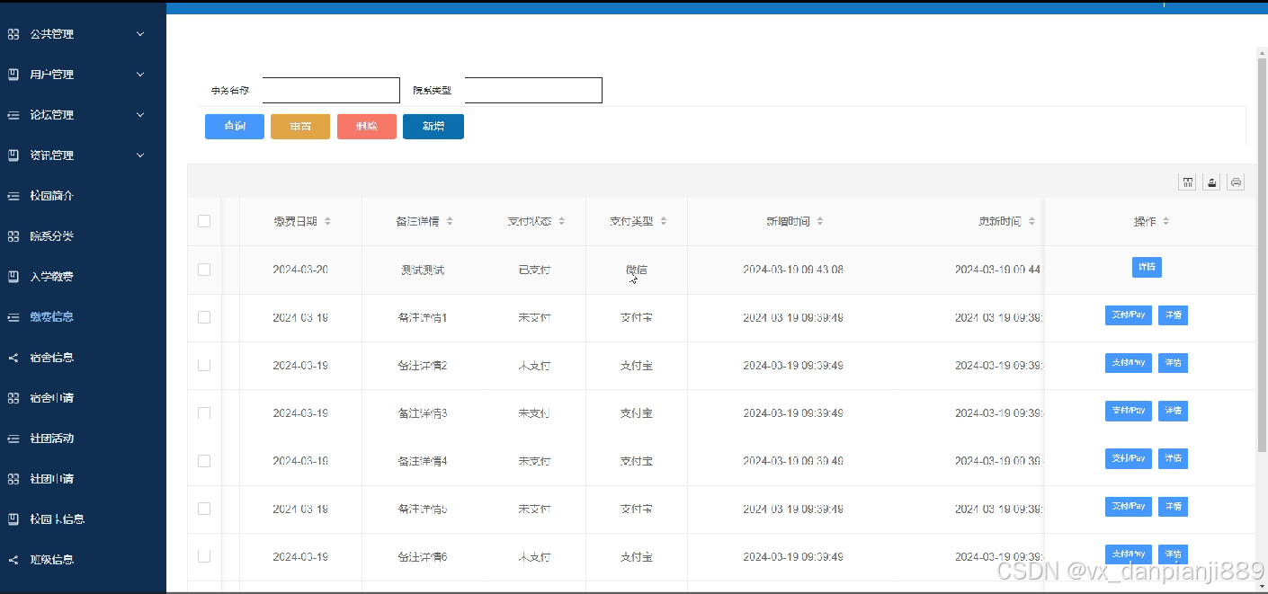 - 缴费信息:管理员可以管理学生的缴费信息,包括查看缴费记录、审核缴费状态、生成财务报表等,确保缴费数据的准确性和完整性。