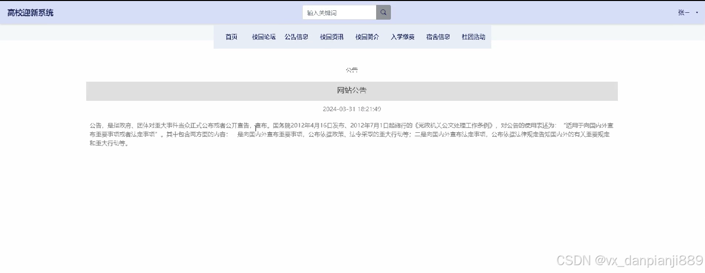 用户点击“公告信息”这个菜单,可以查看学校发布的重要通知和公告信息,包括迎新事项、政策变动等,界面如下图所示。