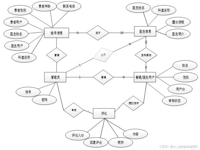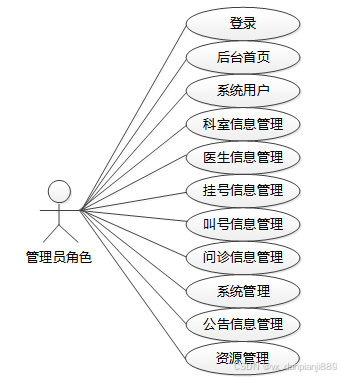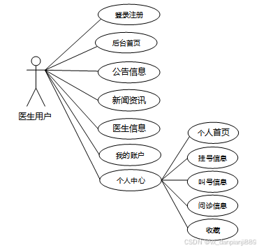 - 用户注册登录:医生用户可以后台注册进入到系统中,对系统中的信息浏览,但是想要实现查询挂号、评论操作,就必须有这个系统的账号。