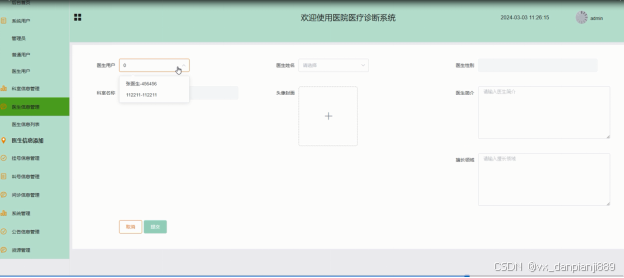 (4)医生信息管理:管理员对医生信息进行管控,同时支持通过关键词对医生信息进行搜索查询和增删改查。