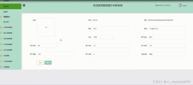 (2)系统用户:管理员可以对医院医疗诊断系统中的管理员以及前台注册的普通用户进行增删改查。