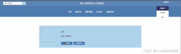 (1)用户注册登录:用户注册为普通用户并登录“星光”演唱会网上订票系统;用户对个人信息的增删改查,比如个人资料,密码修改。