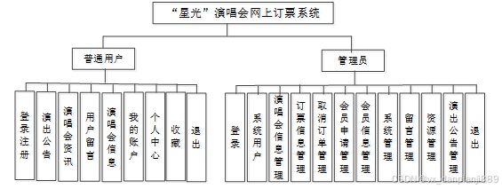 按照“星光”演唱会网上订票系统的角色,我划分为了管理员模块+普通用户模块这两大部分。