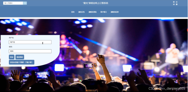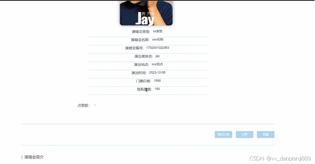 (4)演唱会信息:用户进行演唱会信息的阅览,通过查询演唱会信息,可对某一个演唱会信息进行购买订票+点赞+评论+收藏。