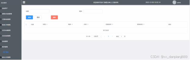 (9)演出公告:管理员点击“演出公告”菜单可以查看到系统中的所有公告信息,对已经存在的公告,管理员可以修改,也可以添加新的公告或者删除公告。