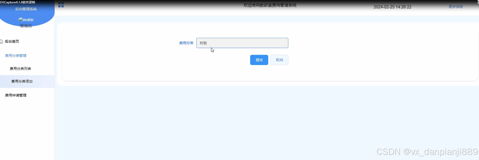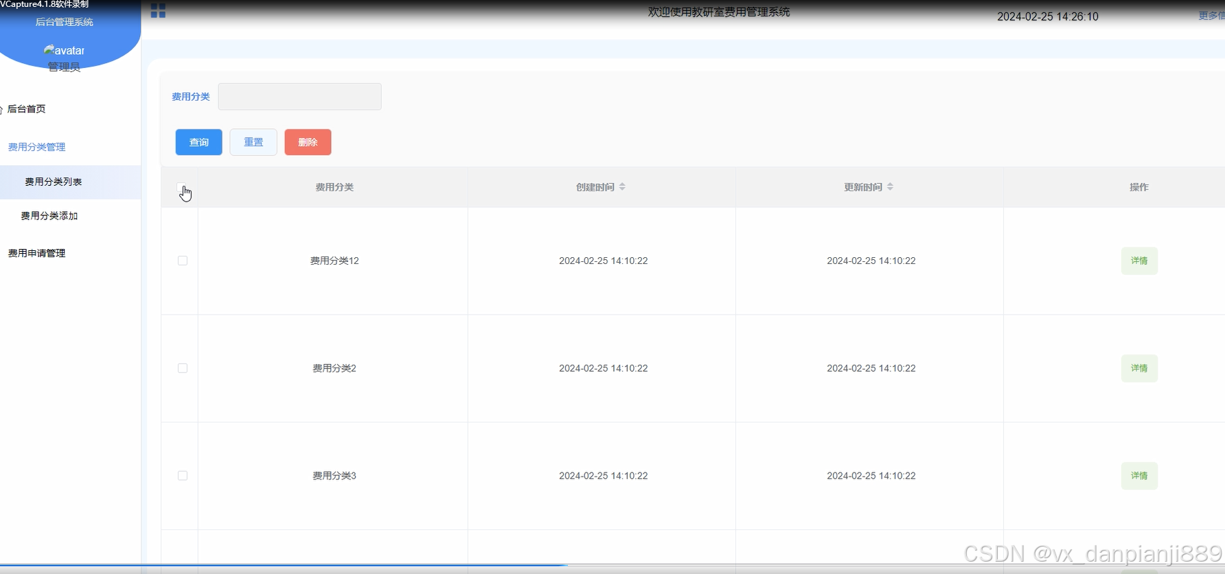 - 费用分类管理:管理员可以在费用分类管理模块对费用进行分类管理,包括添加新的费用分类、修改分类信息、删除费用分类等操作,方便对费用进行统计和管理。