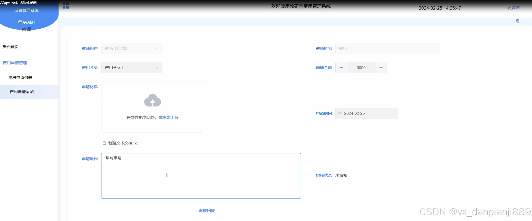- 费用申请管理:教师用户可以在费用申请管理模块进行费用申请的管理。费用申请列表功能允许教师用户查看已提交的费用申请列表,包括申请的费用类型、申请时间、状态等信息。费用申请添加功能允许教师用户新增费用申请,包括选择费用类型、填写费用金额、填写申请理由等。