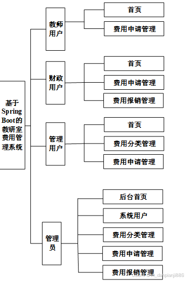 教研室费用管理系统分为四大部分:管理员模块、财政用户、管理用户、教师用户模块。