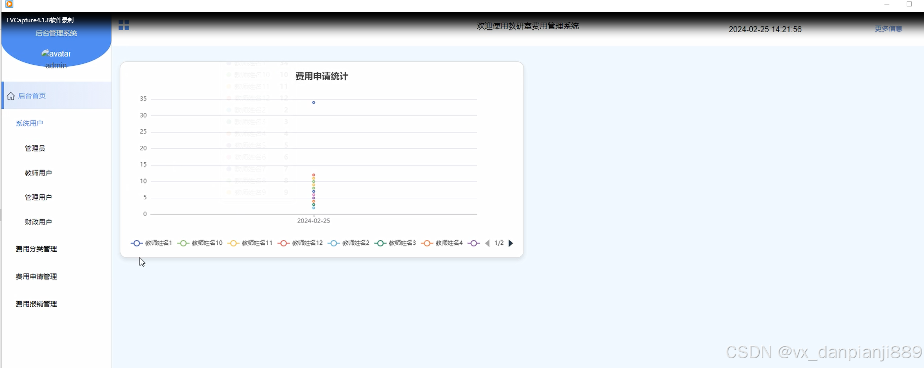 - 后台首页:教师用户登录后可以访问后台首页,以查看系统的整体运行情况,包括费用申请情况、费用报销情况、系统用户数量等数据统计信息。
