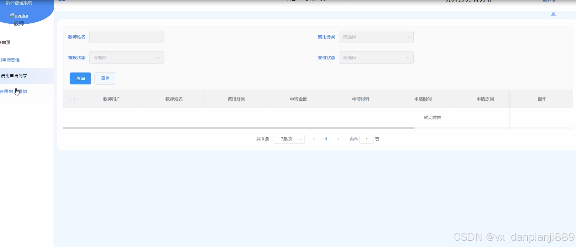 教师用户点击“费用申请管理”这一菜单的时候,会出现费用申请列表和费用申请添加这两个子菜单,可以对这两个模块进行增删改查操作。费用申请列表和费用申请添加如下图所示。