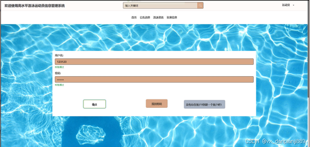 基于springboot的高水平游泳运动员信息管理系统中的注册后的用户是可以通过自己的账户名和密码进行登录的,当用户输入完整的自己的账户名和密码信息并点击“登录”按钮后,将会首先验证输入的有没有空数据,再次验证输入的账户名+密码和数据库中当前保存的用户信息是否一致,只有在一致后将会登录成功并自动跳转到基于springboot的高水平游泳运动员信息管理系统的首页中;否则将会提示相应错误信息,用户登录界面如下图4-2所示。