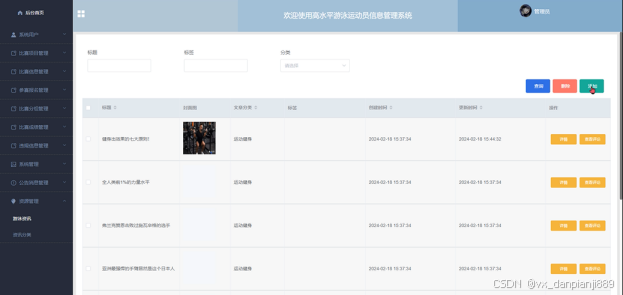 资源管理: 管理员可以管理游泳资讯和资讯分类,包括添加、编辑、删除资讯和分类。