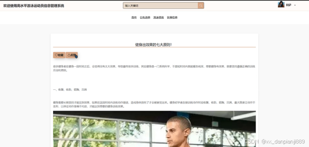 当用户点击“游泳资讯”后,可以查看系统发布的游泳资讯列表,点击任意资讯可以进入资讯详情界面,用户可以查看、点赞、收藏、评论等。界面如下图4-3所示。