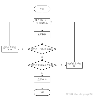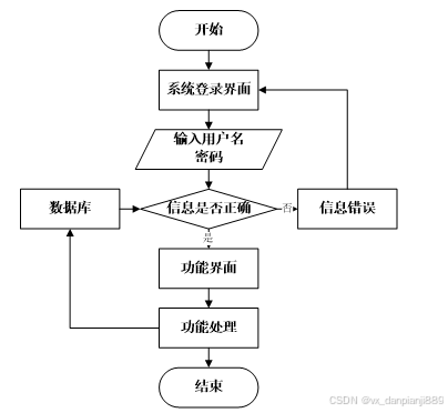 用户打开并进入系统后,会先显示登录界面,输入正确的用户名和密码,系统自动检测信息,若信息无误,则用户会进入系统功能界面,进行操作,否则会提示错误无法登录,操作流程如图2-3所示。