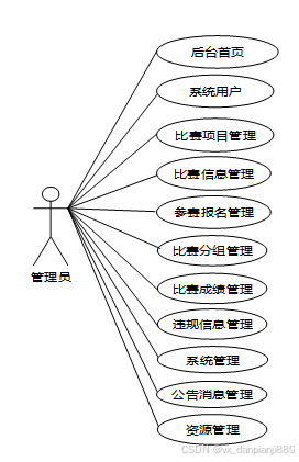 系统主要包括以下模块:比赛项目管理、比赛信息管理、参赛报名管理、比赛分组管理、比赛成绩管理、违规信息管理、系统管理(轮播图管理)、公告消息管理、资源管理。