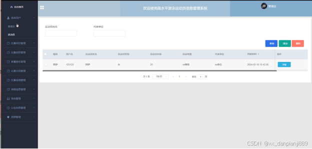 基于springboot的高水平游泳运动员信息管理系统中的管理人员是可以对注册的运动员用户进行管理的,也可以对管理员进行管控。界面如下图4-7所示。