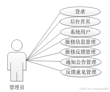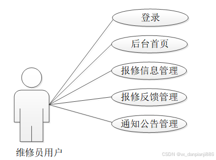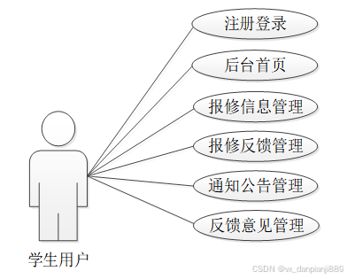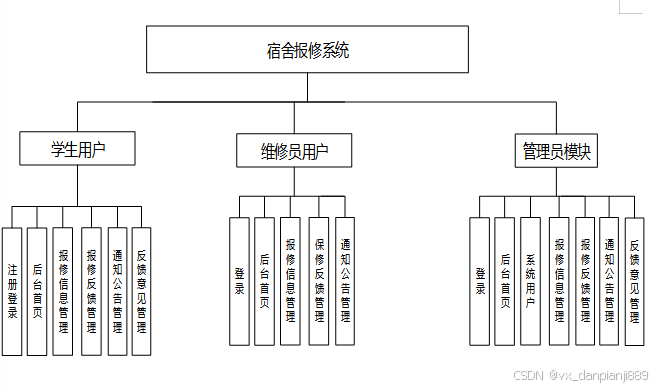 按照宿舍报修系统的角色,主要包括学生用户模块、维系员用户模块和管理员模块,其主要内容如下: