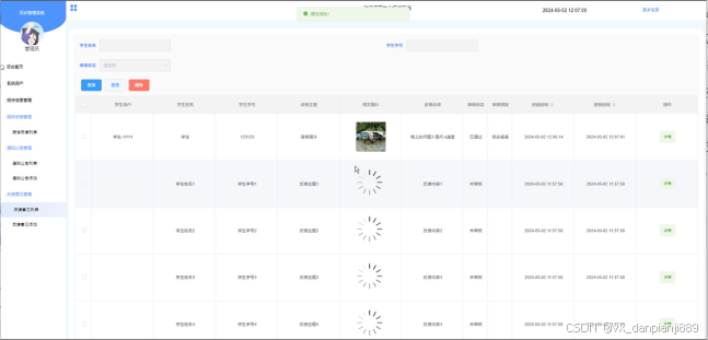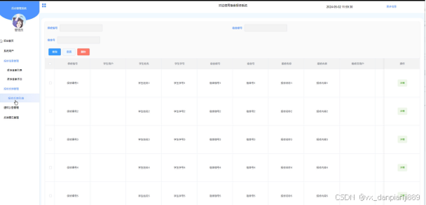 管理员负责审核和回复用户的反馈意见。可以查看意见列表,对每一条反馈意见进行详情查看,并根据需要进行搜索、重置或删除操作。此外,管理员还可以根据学生的姓名或学号,以及意见的审核状态进行搜索,以便更精准地管理用户反馈。反馈意见管理界面如下图所示。