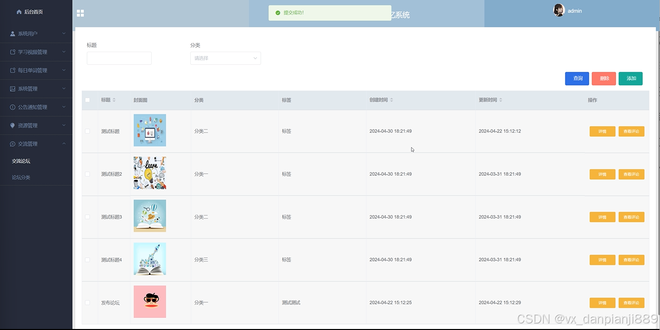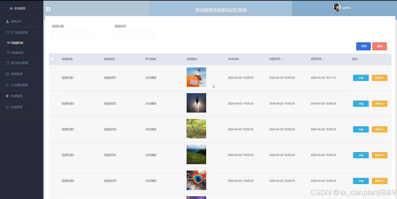 - 学习视频管理:管理员可以轻松管理学习视频资源,包括添加新视频、查询视频信息、删除不需要的视频,并可以查看用户学习视频的详情和评论。同时,管理员还可以根据视频标题和类型进行高效搜索,并支持视频播放功能。