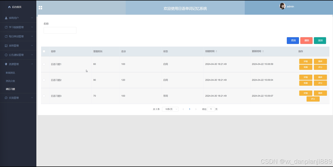 - 资源管理:管理员可以对新闻资讯进行全面管理,包括查看资讯详情、处理用户评论、查询、删除和添加新闻资讯。管理员还可以根据标题、标签和分类进行高效搜索。此外,管理员还可以管理资讯分类、课后习题和题库,支持查看习题详情、答题和评分等操作。
