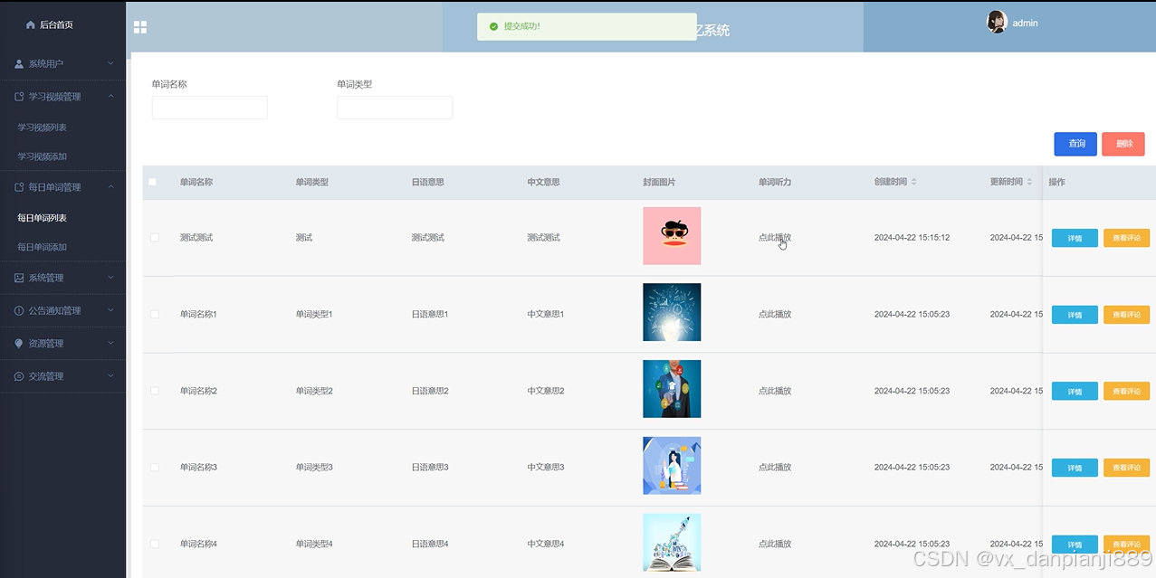 - 每日单词管理:管理员可以方便地管理每日单词内容,包括添加新单词、查看单词详情、删除单词以及处理用户评论。管理员还可以根据单词名称和类型进行搜索,并提供单词听力的音频播放功能。