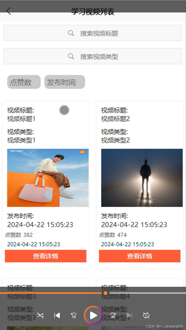 - 学习视频:学生用户可以查看学习视频列表的详细信息,包括视频标题、类型、发布时间等。他们可以通过不同的搜索条件找到感兴趣的视频,并对喜欢的视频进行点赞、收藏和评论,加强学习互动。